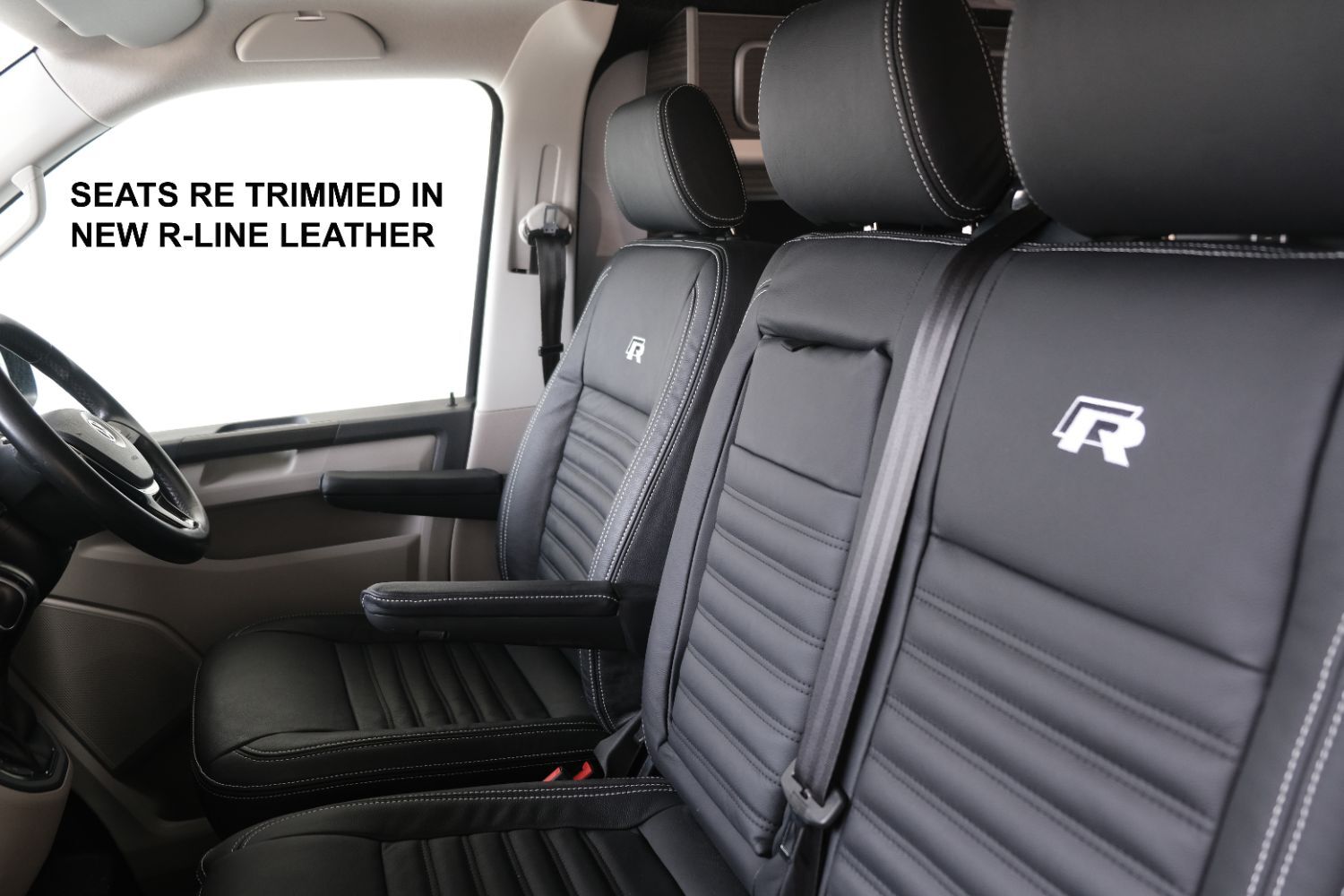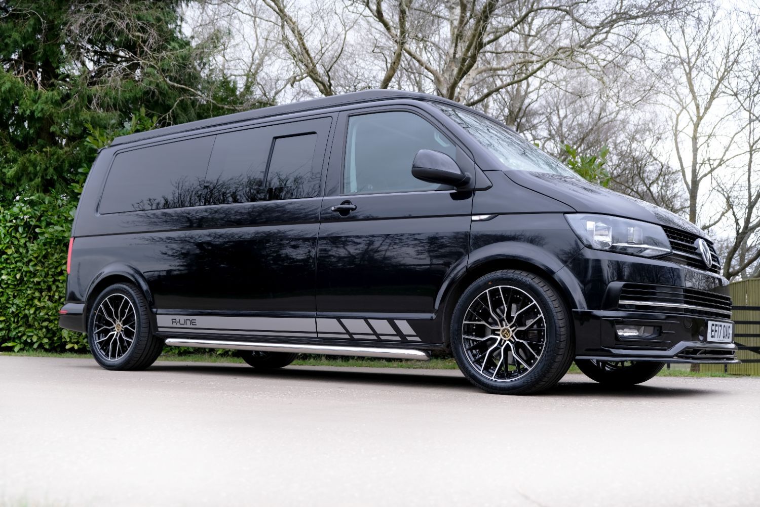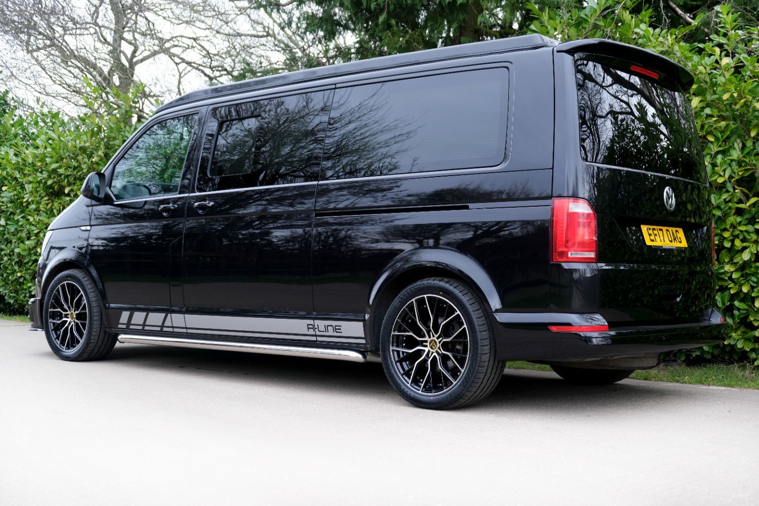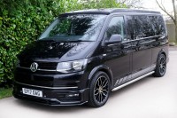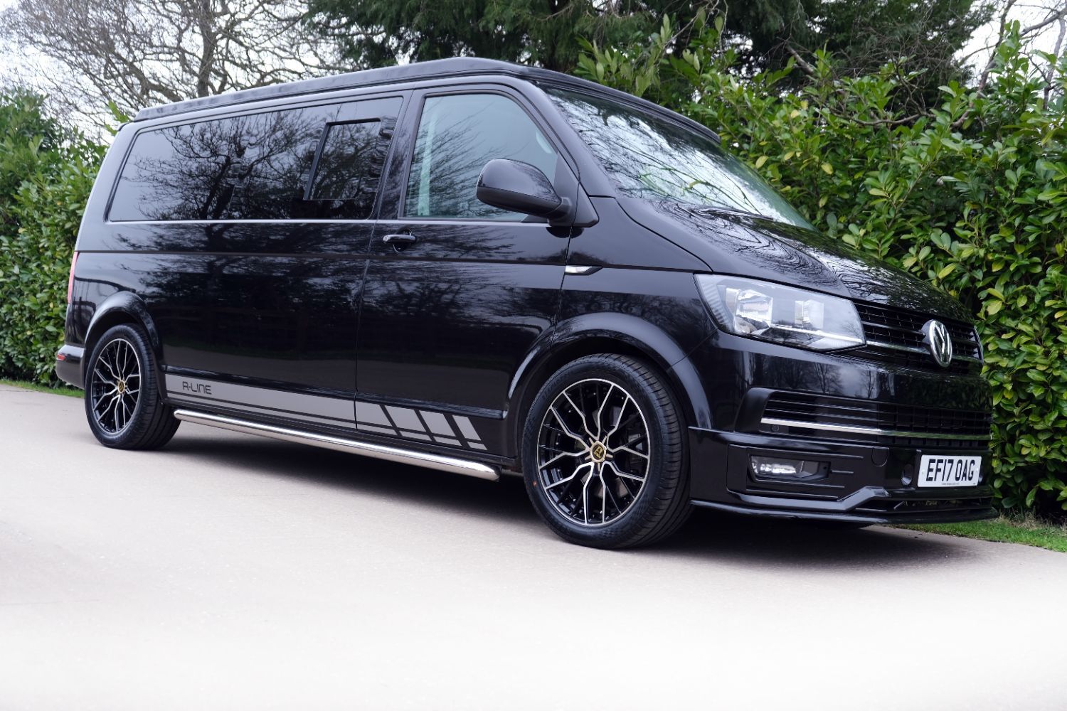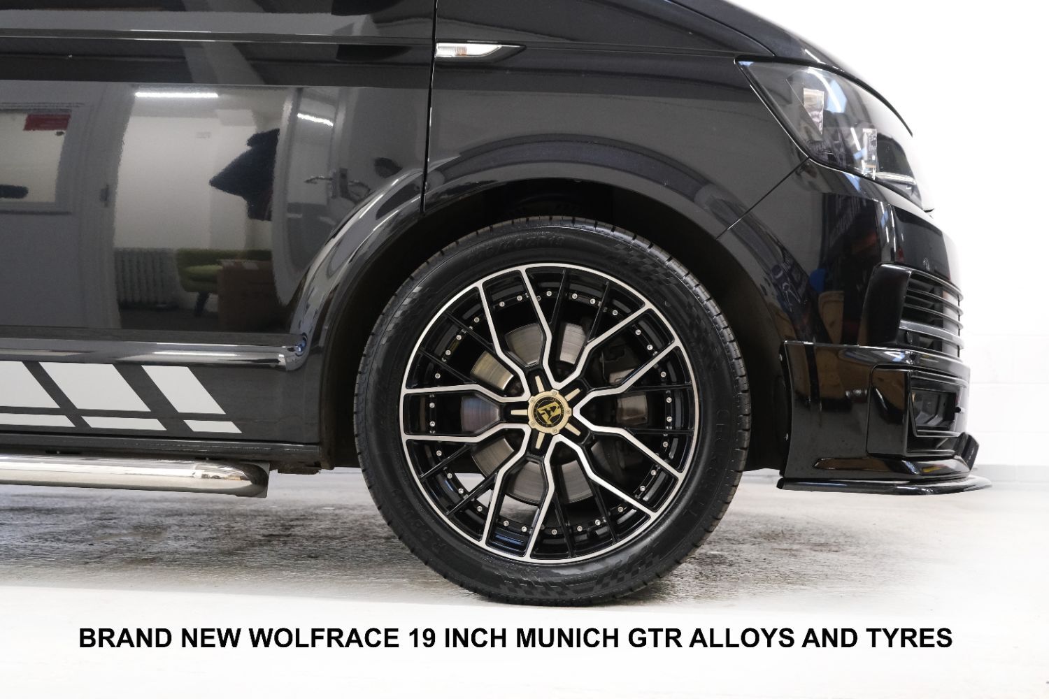 A SUPERB CONDITION VW TRANSPORTER RARE LWB TAILGATE R LINE CAMPER VAN CONVERSION *** THIS IS A BRAND NEW CONVERSION CARRIED OUT BUY US *** MASSIVE SPEC WHICH INCLUDES - GENUINE SPORTLINE BUMPER + FRONT LIP & REAR SPOILER - BRAND NEW WOLFRACE MUNICH GTR 19 INCH ALLOYS & TYRES - H&R SPRINGS 40MM DROP FRONT & REAR - VW DISCOVER MEDIA WITH SATELLITE NAVIGATION SYSTEM & BLUETOOTH PHONE CONNECTION - BLUETOOTH PHONE AND MUSIC STREAMING - FRONT & REAR PARKING SENSORS - FACTORY AIR CON - CRUISE CONTROL - HEATED FRONT WINDSCREEN - MULTI FUNCTION DASH - ELECTRIC FOLDING MIRRORS - LEATHER STEERING WHEEL *** TOP QUALITY INTERIOR FINISH WITH LEATHER TRIMMED SLIDING ISOFIX RIB BED - PASSENGER SEAT M1 TESTED SWIVEL BASE TO FACE REAR - VANSHADES BLACKOUT THERMAL BLIND SYSTEM THROUGHOUT- R LINE LEATHER RE-TRIMMED SEATS - DOMESTIC Waeco CRX550 FRIDGE / FREEZER - Thetford Dual Gas HOB &SINK - AUSTOPS TUV TESTED POP TOP ROOF BED WITH PANORAMIC CANVAS - DRIVER AND PASSENGER SIDE REAR OPENING GLASS *** THE VAN HAS ALSO BEEN FULLY INSULATED INCLUDING ALL DOORS - SIDE PANELS AND DEAD MAT ARCHES *** EXCELLENT VW SERVICE HISTORY INCLUDING CAMBELT AND WATER PUMP CHANGE ****