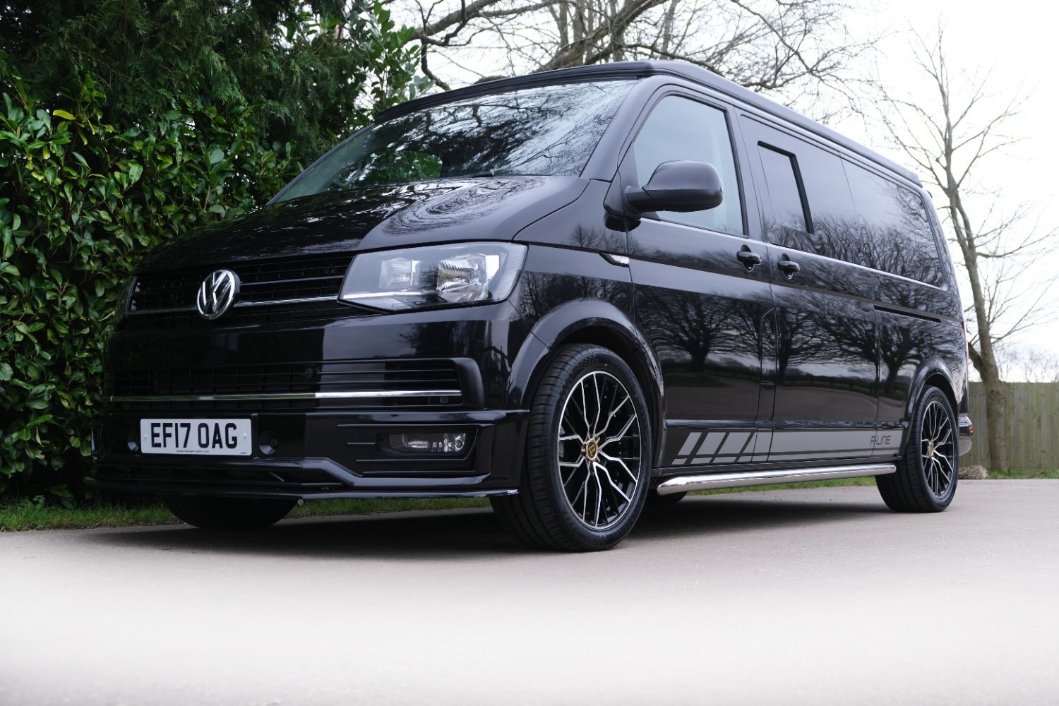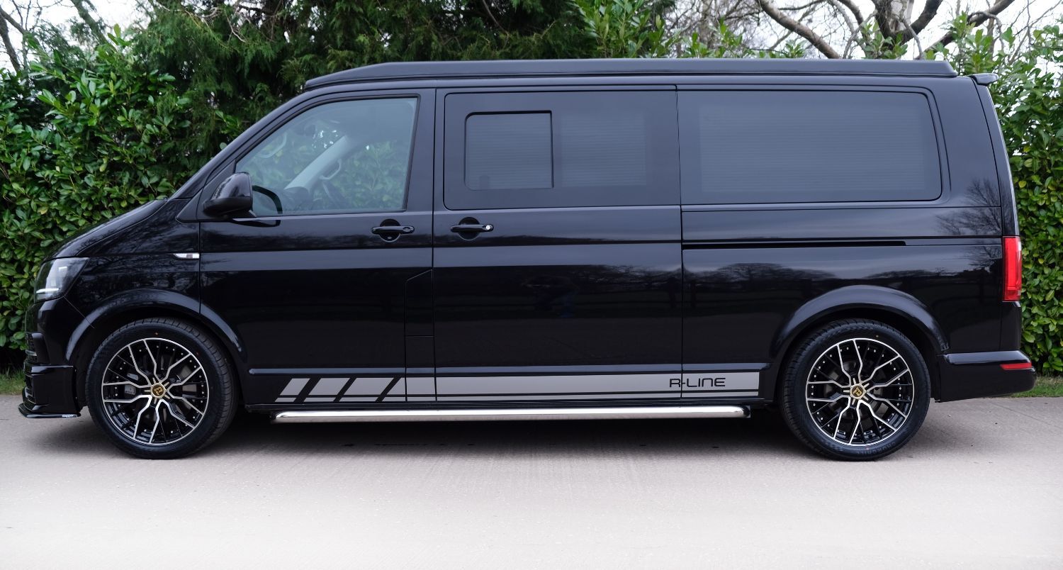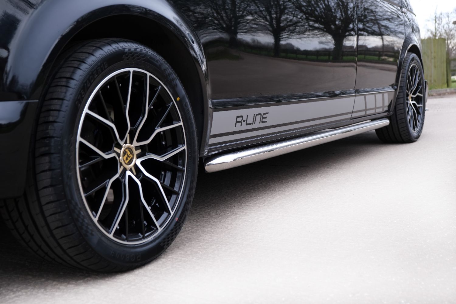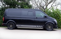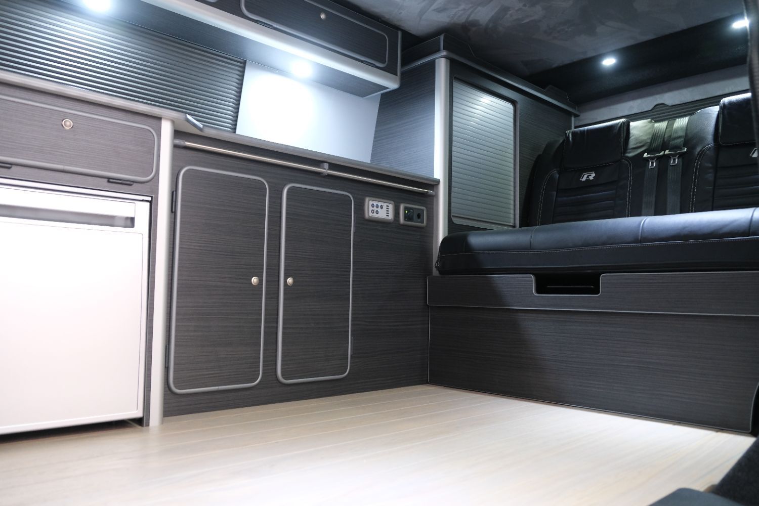 A SUPERB CONDITION VW TRANSPORTER RARE LWB TAILGATE R LINE CAMPER VAN CONVERSION *** THIS IS A BRAND NEW CONVERSION CARRIED OUT BUY US *** MASSIVE SPEC WHICH INCLUDES - GENUINE SPORTLINE BUMPER + FRONT LIP & REAR SPOILER - BRAND NEW WOLFRACE MUNICH GTR 19 INCH ALLOYS & TYRES - H&R SPRINGS 40MM DROP FRONT & REAR - VW DISCOVER MEDIA WITH SATELLITE NAVIGATION SYSTEM & BLUETOOTH PHONE CONNECTION - BLUETOOTH PHONE AND MUSIC STREAMING - FRONT & REAR PARKING SENSORS - FACTORY AIR CON - CRUISE CONTROL - HEATED FRONT WINDSCREEN - MULTI FUNCTION DASH - ELECTRIC FOLDING MIRRORS - LEATHER STEERING WHEEL *** TOP QUALITY INTERIOR FINISH WITH LEATHER TRIMMED SLIDING ISOFIX RIB BED - PASSENGER SEAT M1 TESTED SWIVEL BASE TO FACE REAR - VANSHADES BLACKOUT THERMAL BLIND SYSTEM THROUGHOUT- R LINE LEATHER RE-TRIMMED SEATS - DOMESTIC Waeco CRX550 FRIDGE / FREEZER - Thetford Dual Gas HOB &SINK - AUSTOPS TUV TESTED POP TOP ROOF BED WITH PANORAMIC CANVAS - DRIVER AND PASSENGER SIDE REAR OPENING GLASS *** THE VAN HAS ALSO BEEN FULLY INSULATED INCLUDING ALL DOORS - SIDE PANELS AND DEAD MAT ARCHES *** EXCELLENT VW SERVICE HISTORY INCLUDING CAMBELT AND WATER PUMP CHANGE ****