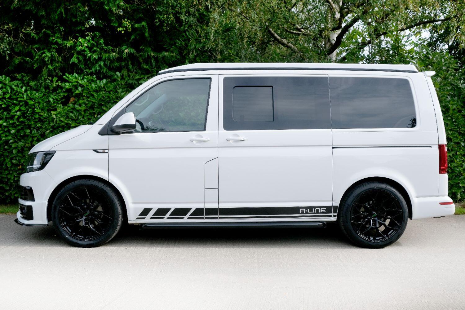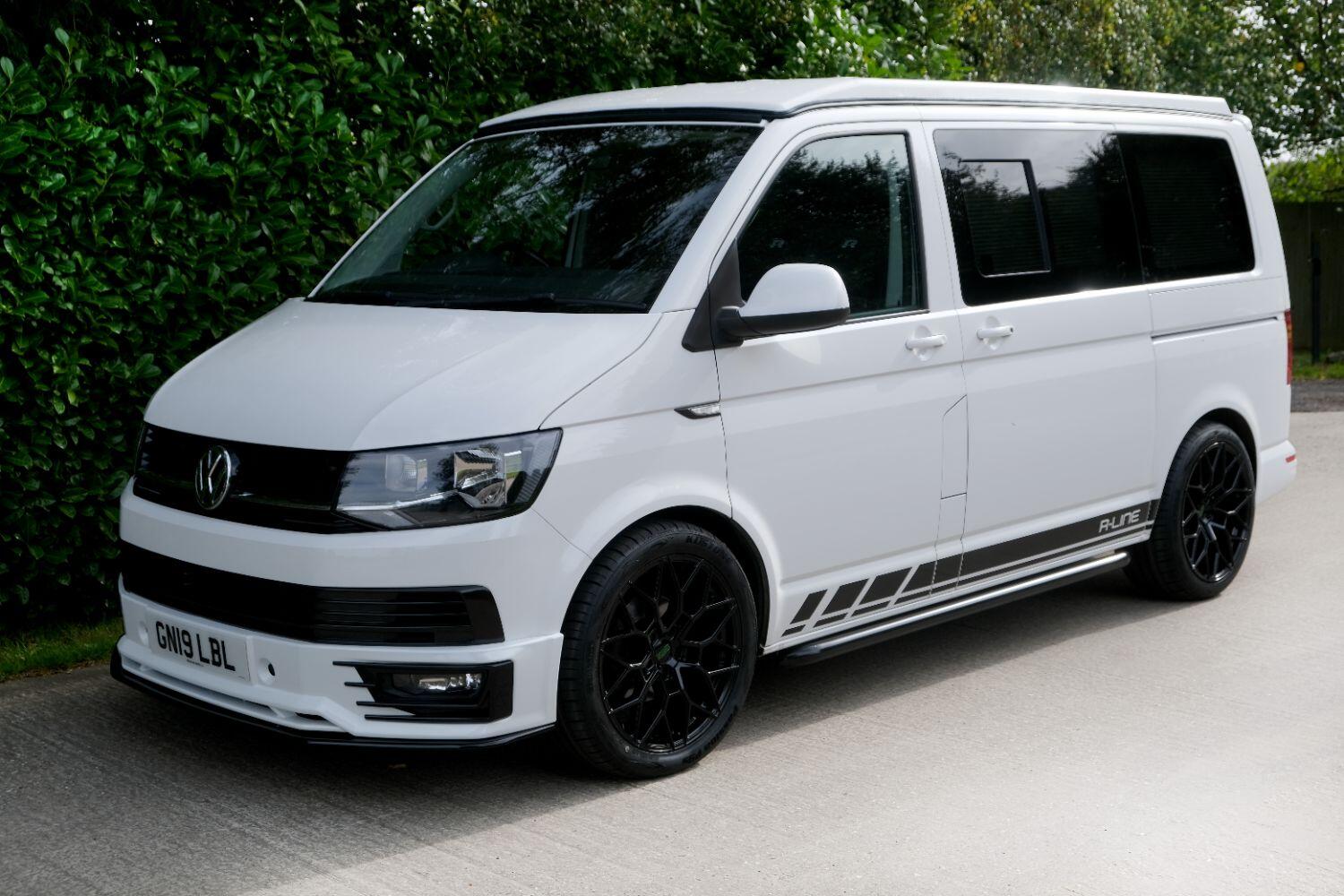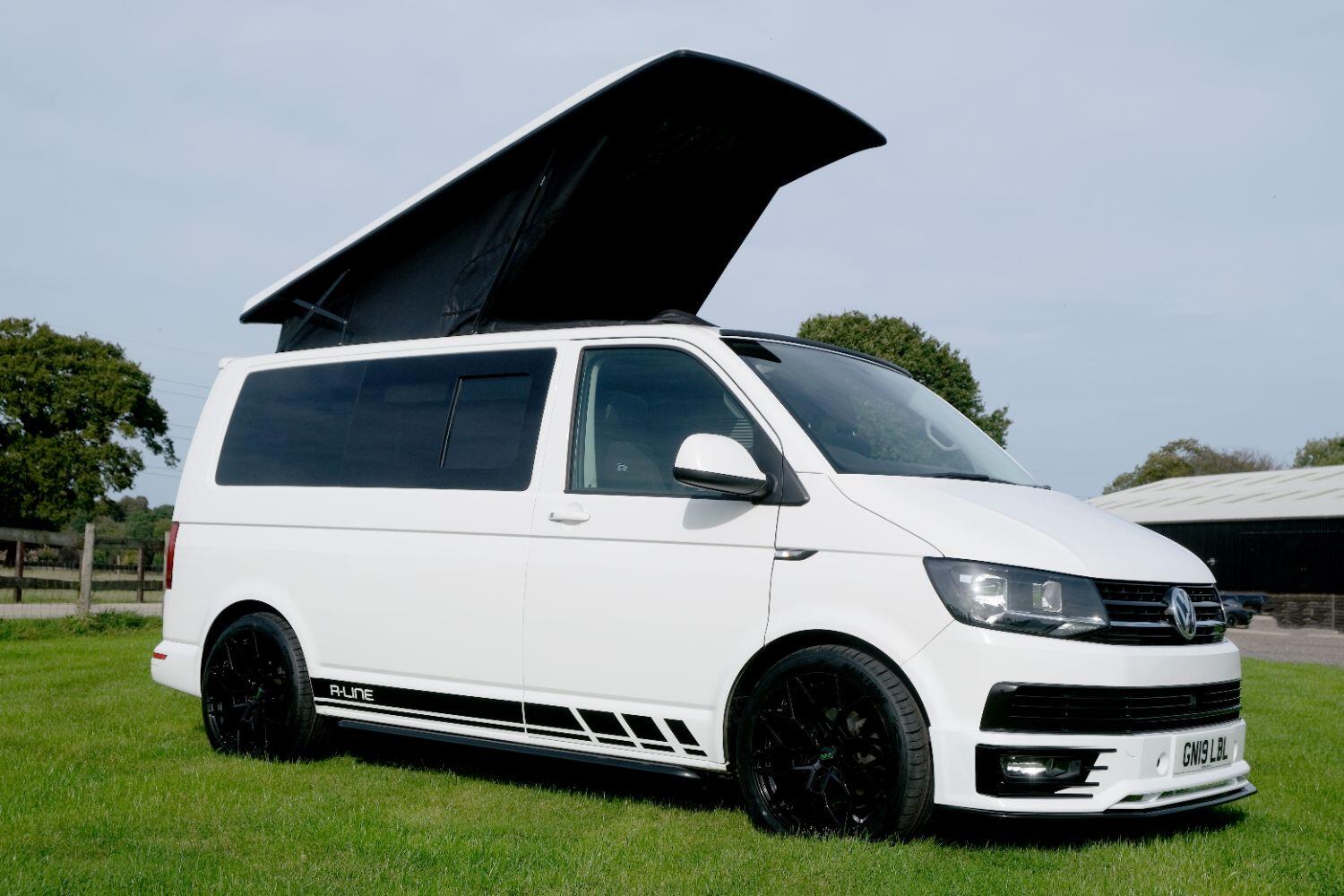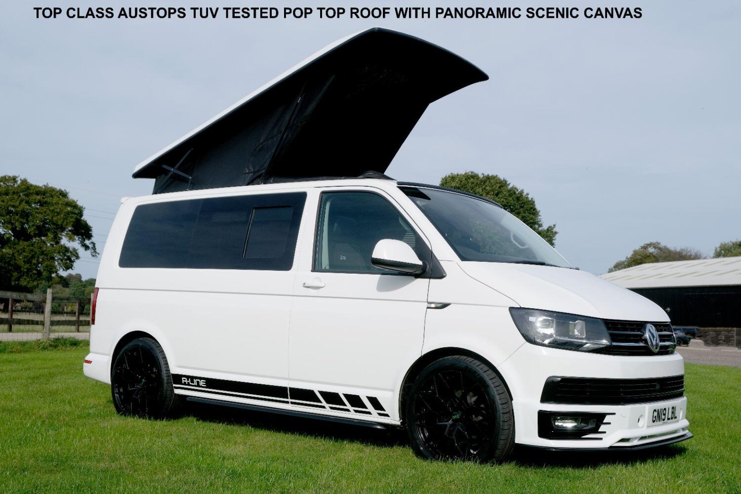 ** A SUPERB CONDITION VW TRANSPORTER R -LINE DSG CAMPER VAN CONVERSION *** THIS IS A BRAND NEW CONVERSION CARRIED OUT BUY US ALL PARTS ARE NEW *** MASSIVE SPEC WHICH INCLUDES - GENUINE SPORTLINE BUMPER - LOWER SPLITTER & REAR SPOILER - LEIGHTON LV-2 20 INCH ALLOYS - H&R SPRINGS 40MM DROP FRONT & REAR - RENOGY SOLAR PANEL PLUS DC TO DC CHARGER - VW DISCOVERY MEDIA SYSTEM - SATELITTE NAVIGATION -BLUETOOTH PHONE CONNECTION - BLUETOOTH PHONE AND MUSIC STREAMING - REAR PARKING SENSORS - FACTORY AIR CON - LED DAYTIME RUNNING LIGHTS - CRUISE CONTROL - MULTI FUNCTION DASH - LEATHER STEERING WHEEL*** TOP QUALITY INTERIOR FINISH RE TRIMMED IN R LINE BLACK LEATHER - PASSENGER SEAT M1 TESTED SWIVEL BASE TO FACE REAR - VANSHADES BLACKOUT THERMAL BLIND SYSTEM THROUGHOUT- CG 50L FRIDGE / FREEZER - THETFORD Dual Gas HOB SINK - AUSTOPS TUV TESTED POP TOP ROOF BED WITH PANORAMIC CANVAS - DRIVER AND PASSENGER SIDE REAR OPENING GLASS - RUSTY LEE M1 & TUV TESTED ROCK N ROLL BED - 240V MAINS HOOK UP *** THE VAN HAS ALSO BEEN FULLY INSULATED INCLUDING ALL DOORS - SIDE PANELS AND DEAD MAT ARCHES *** EXCELLENT SERVICE HISTORY JUST BEEN SERVICED WITH CAMBELT AND WATER PUMP CHANGE - COMES WITH 1 YEARS MOT*** SWB ***, Upgrades - 12v Power, ABS, Air Con, Air Conditioning, Alloy Wheels, Battery Charger, Blinds, Bluetooth, CD / Radio, Central Locking, Colour Coded Bumpers, Cruise Control, Electric Mirrors, Electric Windows, External 240v, Free Standing Table, Fridge/Freezer, Gas Hob, Heated Mirrors, Internal Window Blinds, Leather Upholstery, Leisure Battery, Mains electric, Power Steering, Rear Seat belts, Satellite Navigation, Second Battery, Solar Panels, Spare wheel, Swivel Chairs, Swivel Passenger Seat